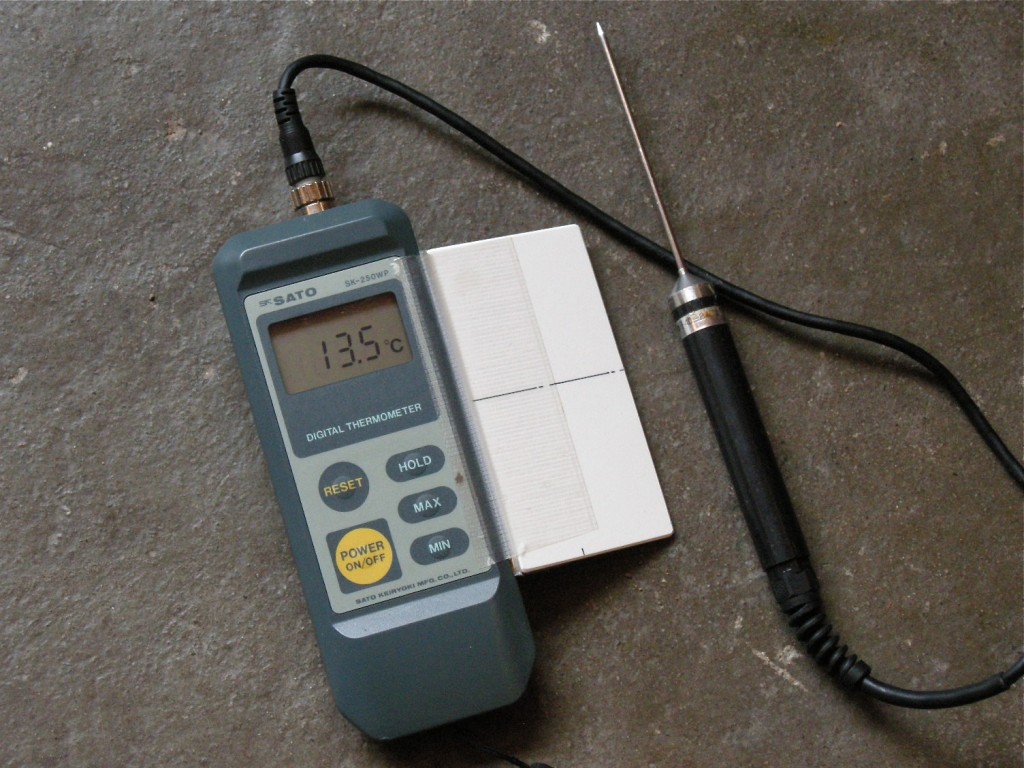 アクシデントといえば、こうした電子機器には故障がつきものです。まったくうんともすんともいわないのならダメだということがはっきり分かるのでまだいいのですが、測定・表示が微妙に狂った状態だと、それと気づかないまま正しいデータだと思って誤って記録してしまう可能性があります。そのため、ときおり他の温度計と比較したり、割れない限りは逆に信頼性がある0.1℃目盛の水銀温度計と比較したりする必要があります。